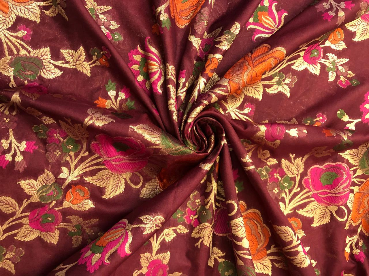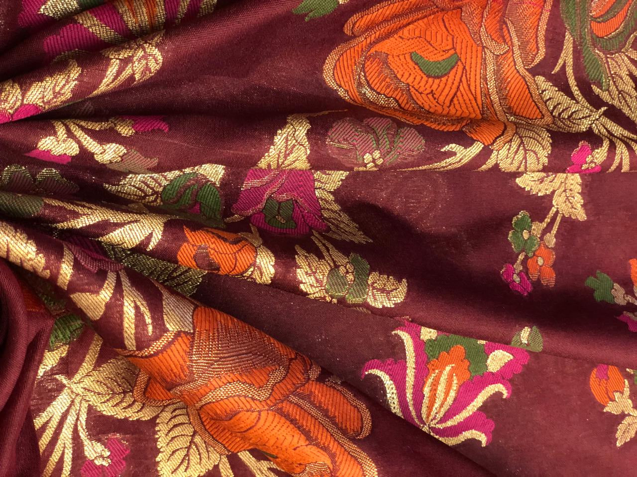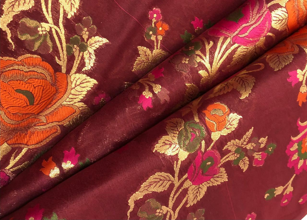Silk Brocade fabric burgundy with pink ,orange ,green and metallic gold floral jacquard 44" BRO1130[1]