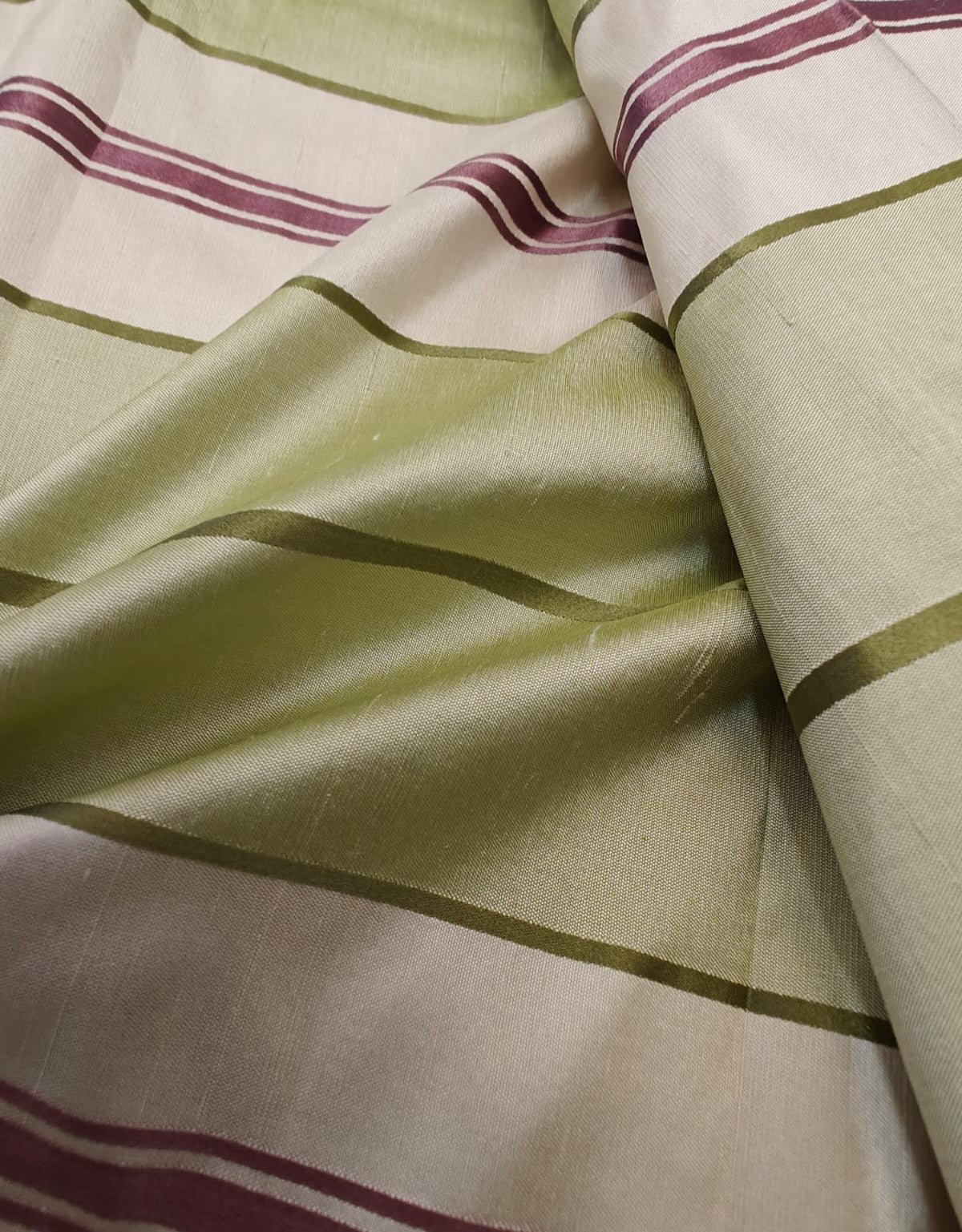 Dupioni (also referred to as Douppioni or Dupion) is a plain weave crisp type of silk fabric, produced by using fine thread in the warp and uneven thread reeled from two or more entangled cocoons in the weft. This creates tightly-woven yardage with a highly-lustrous surface.It is sometimes confused with 'shantung' or 'raw silk' which is usually lighter in weight and has a finer weave than dupion.