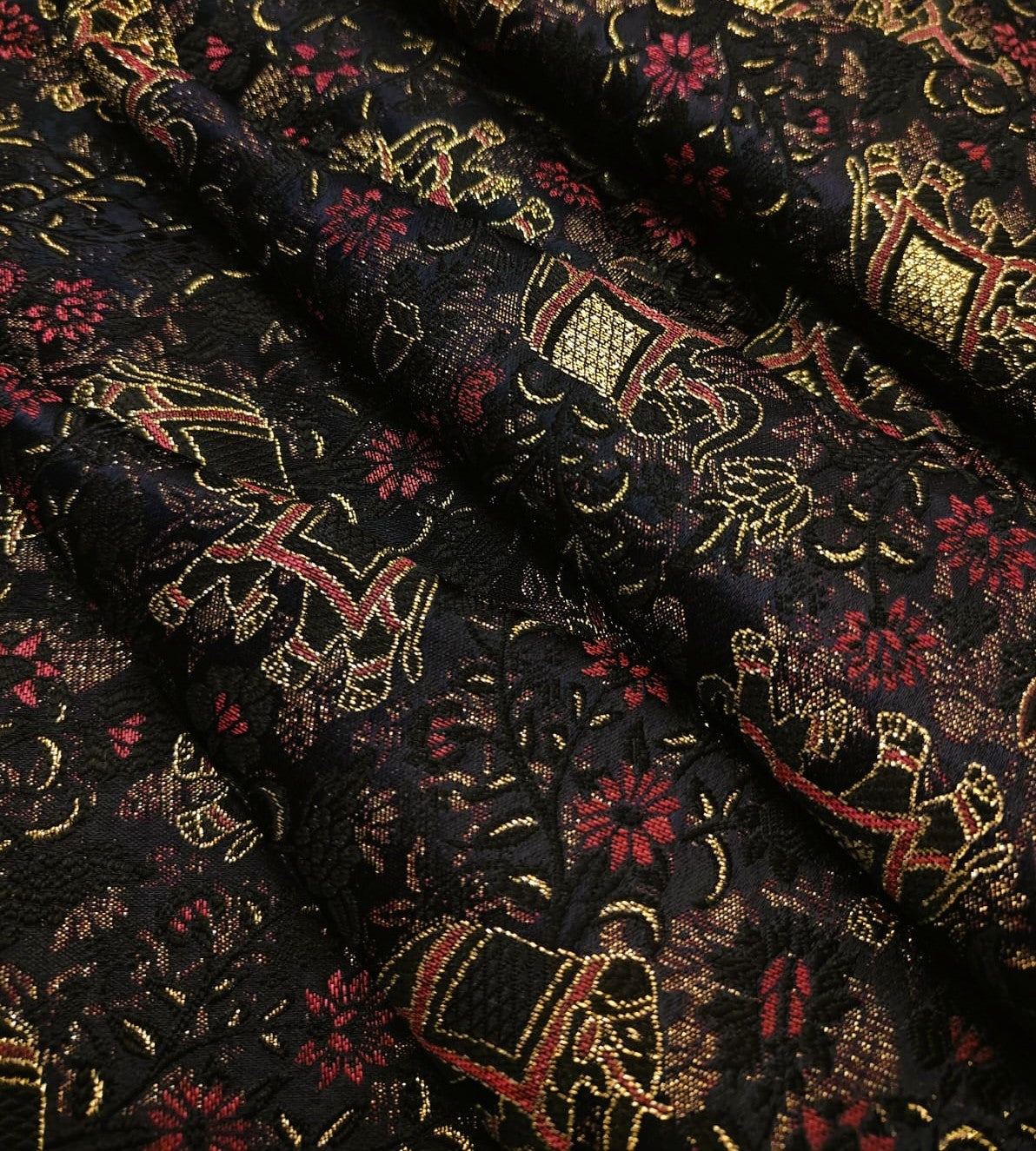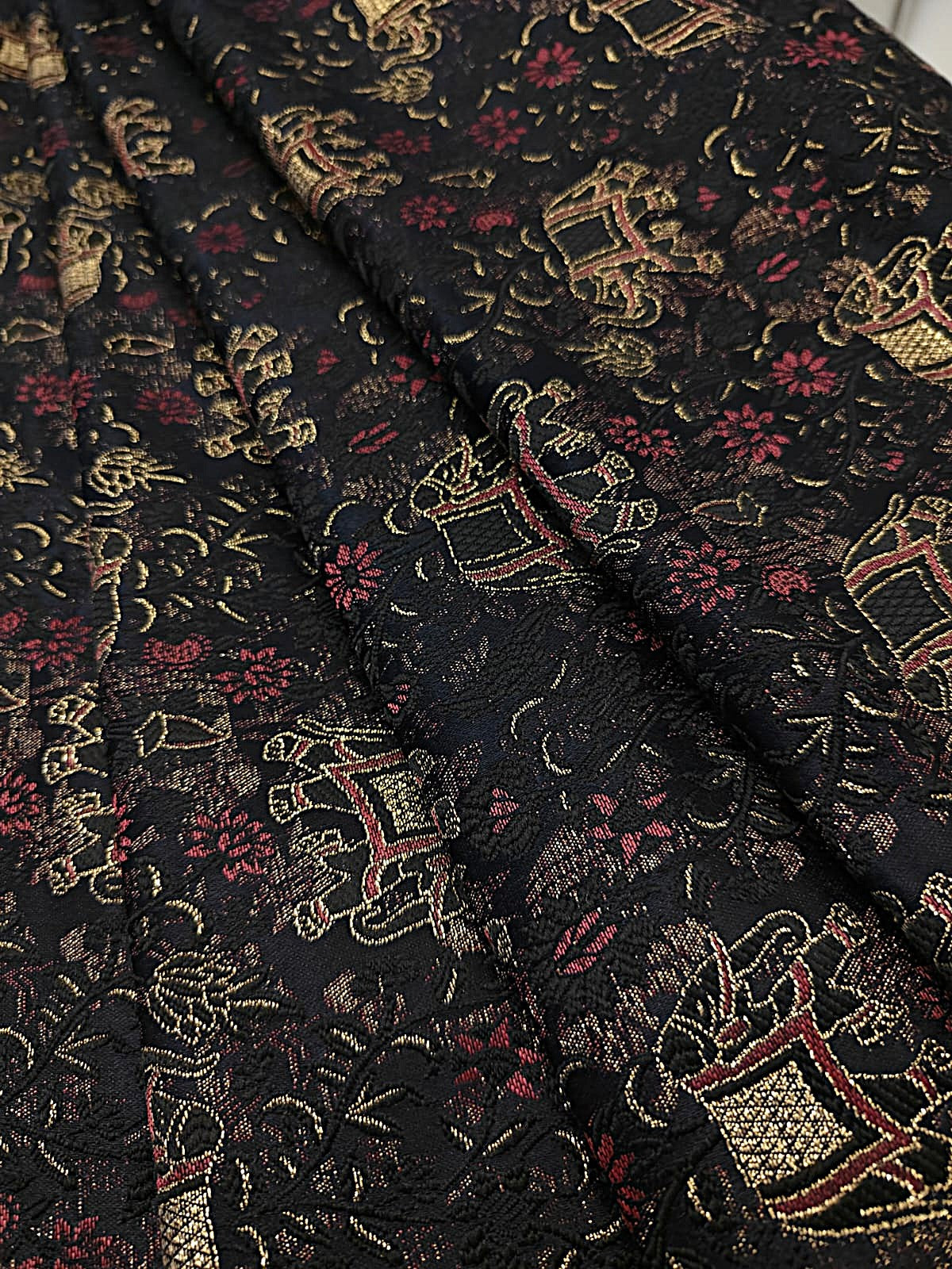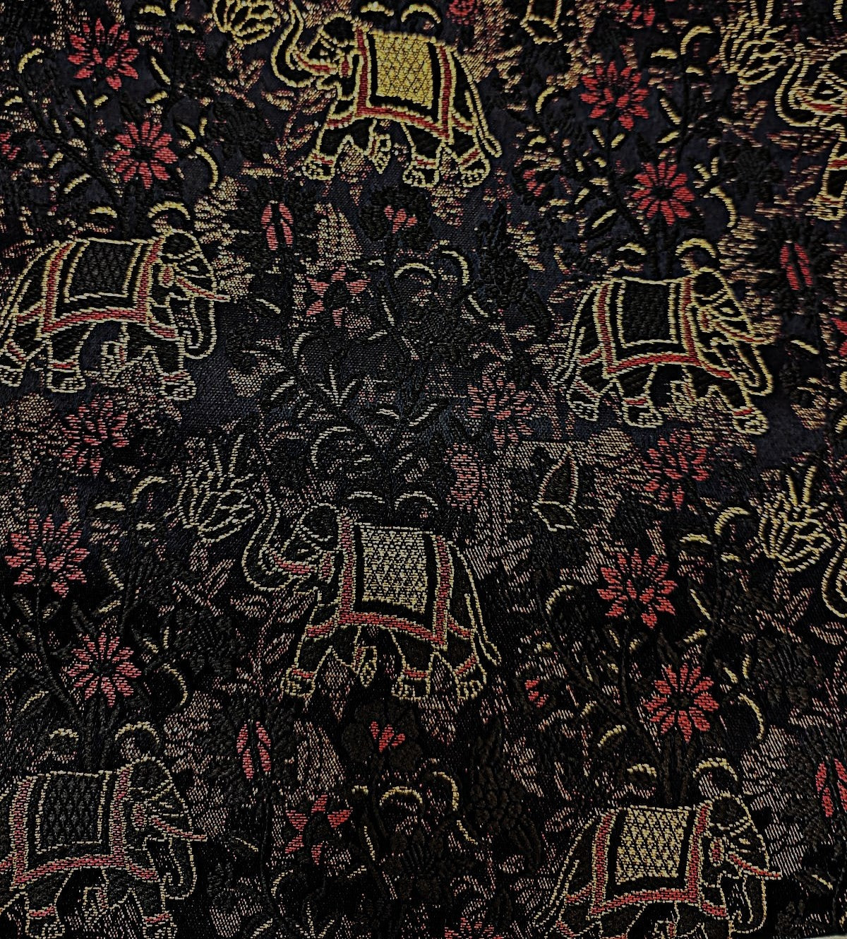 Silk Brocade fabric black with delicate red flowers and elephant motifs BRO1156[2] - The Fabric Factory