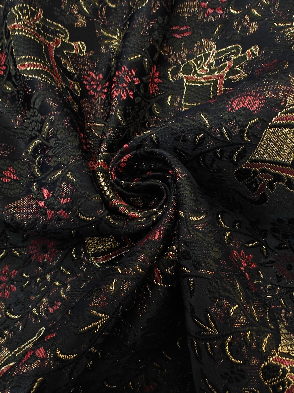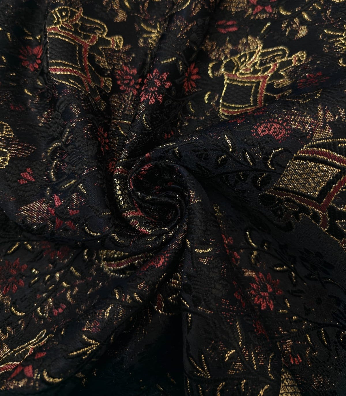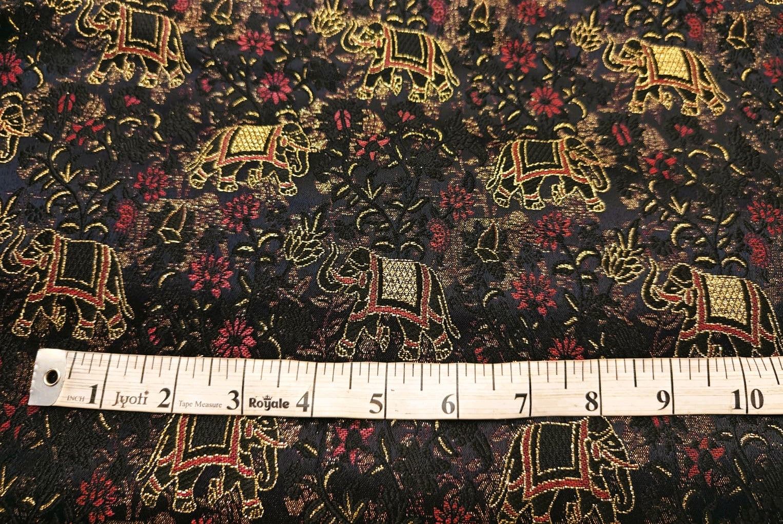 Silk Brocade fabric black with delicate red flowers and elephant motifs BRO1156[2] - The Fabric Factory
