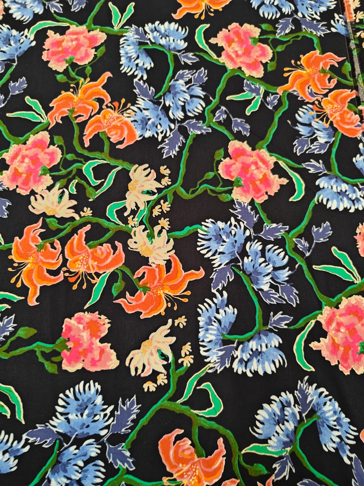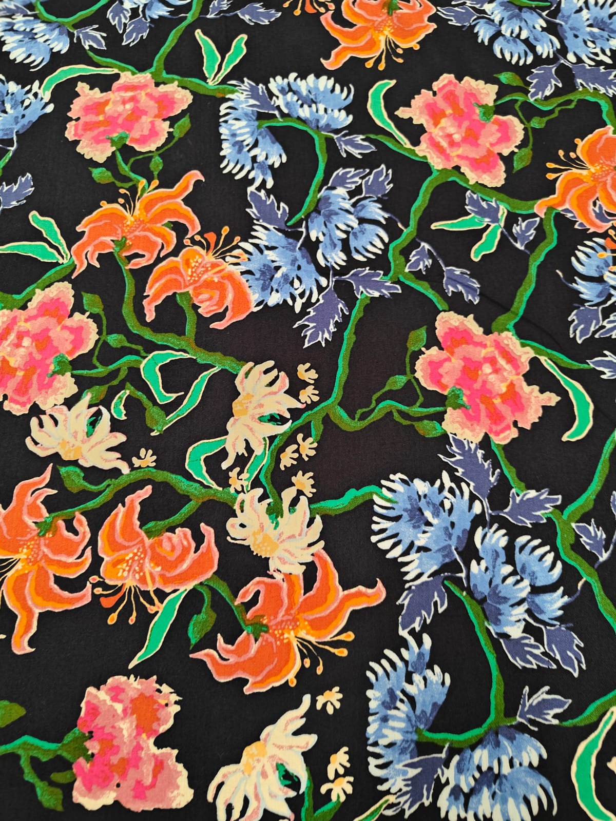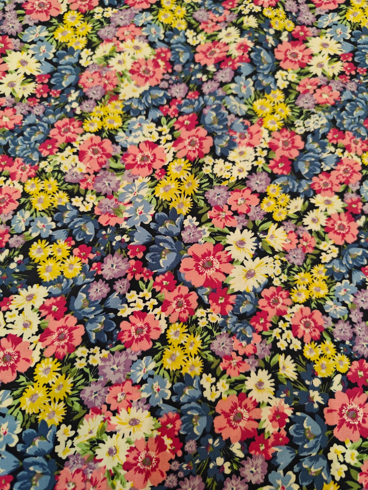 100% cotton poplin print peach finish dark navy in multi flowers and leaves available in 2 sizes small and medium [20404/05]