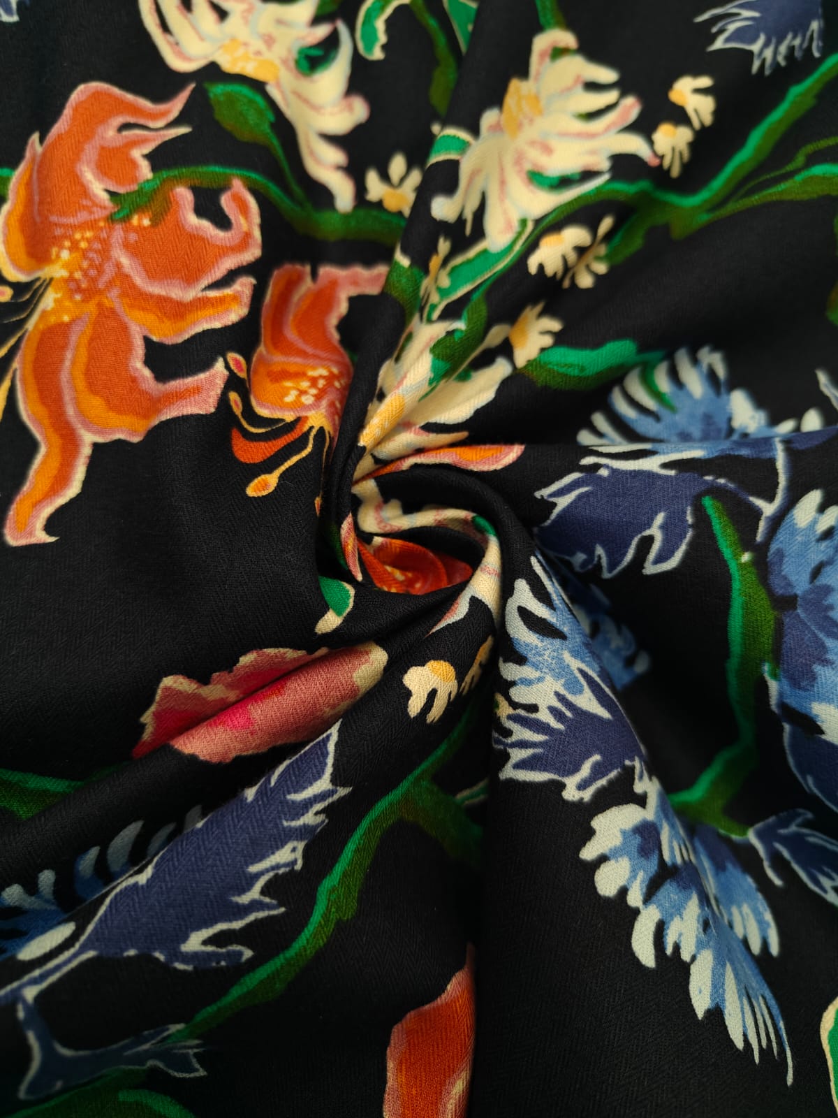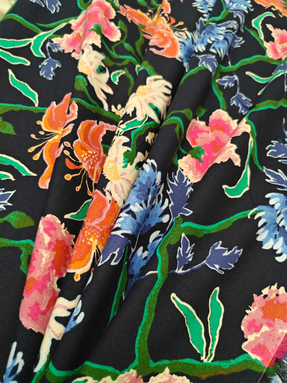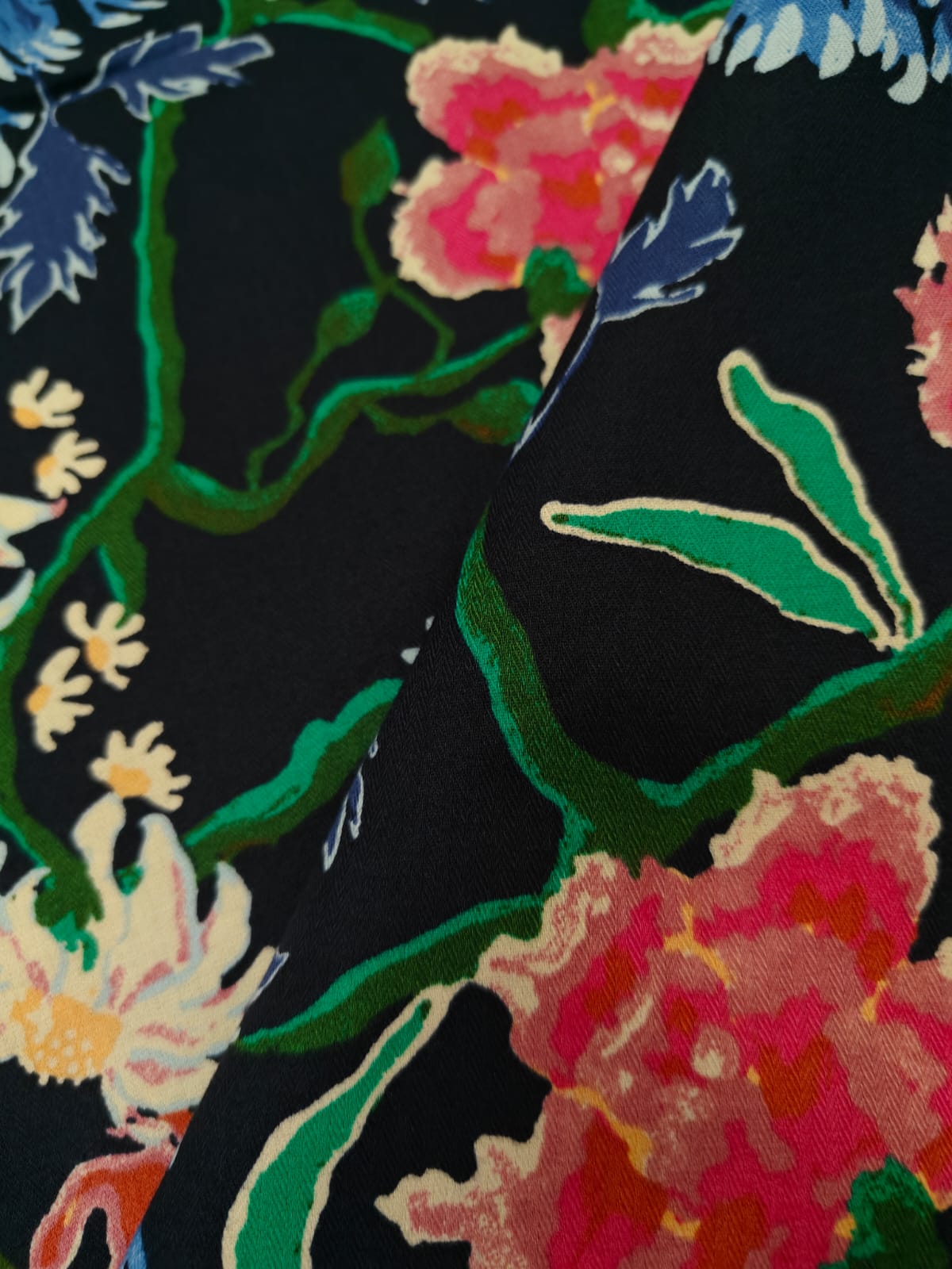 100% cotton poplin print peach finish dark navy in multi flowers and leaves available in 2 sizes small and medium [20404/05]