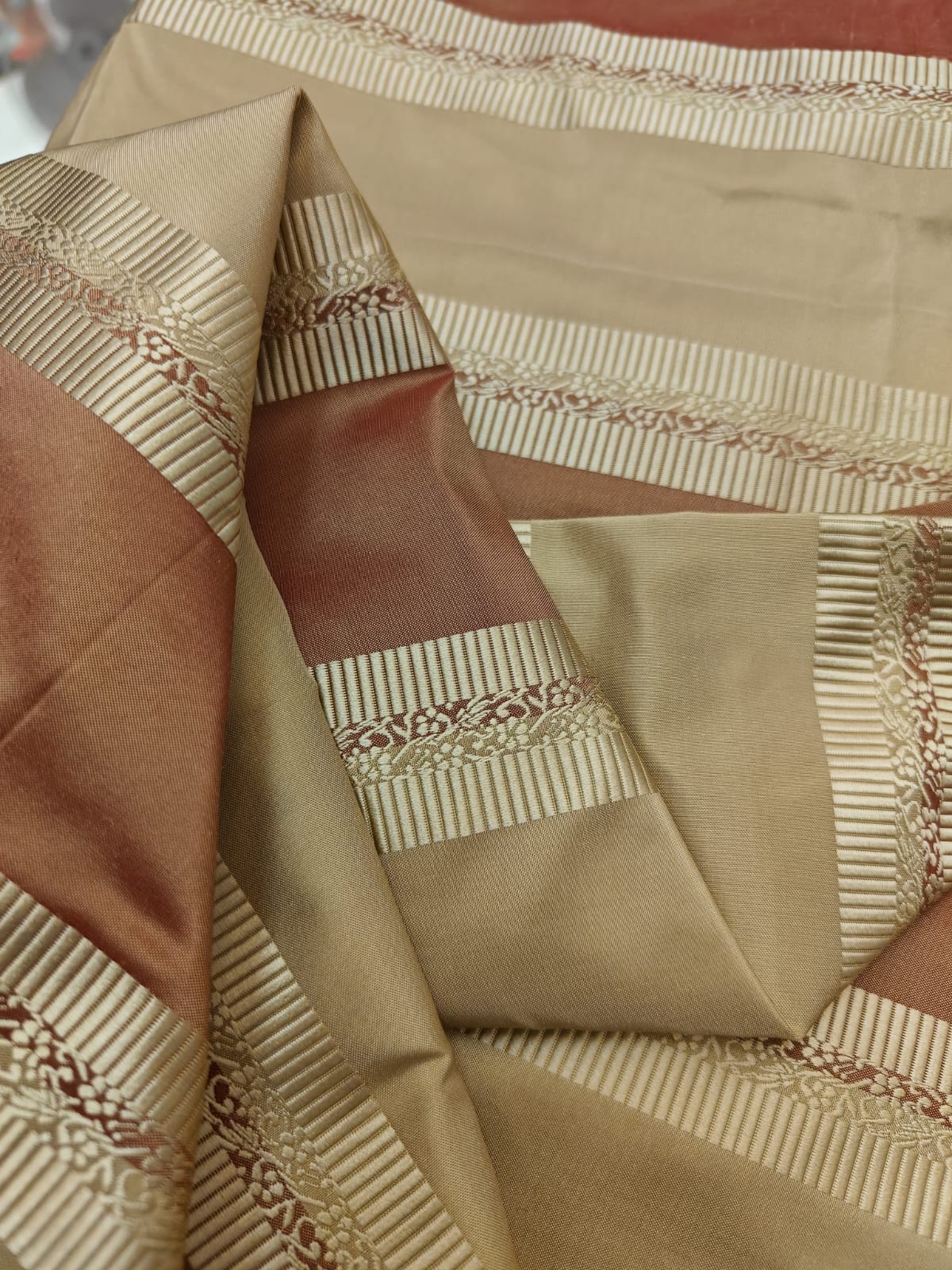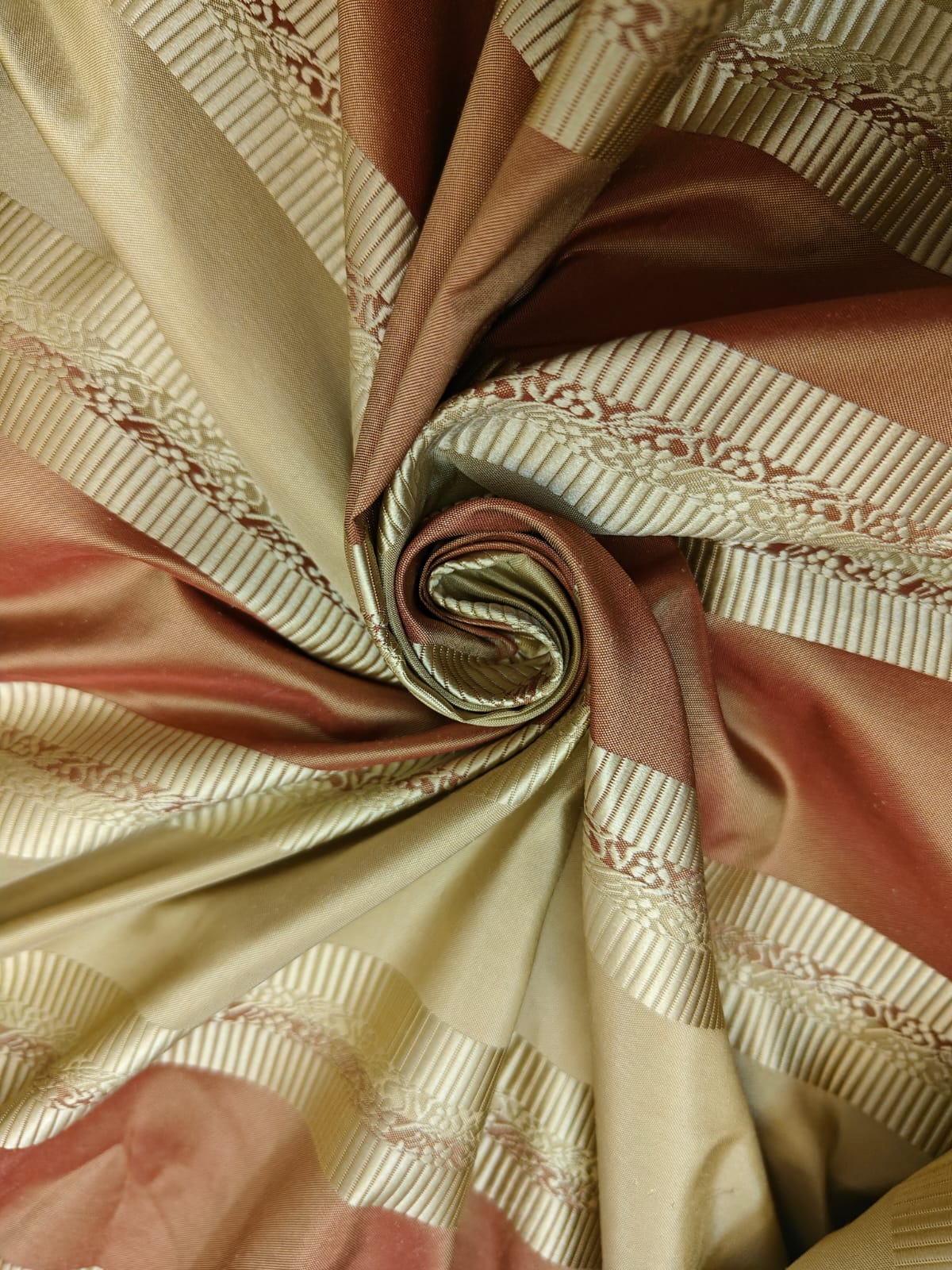 Taffeta is a crisp, smooth, plain woven fabric made from silk .The word is Persian in origin and means "twisted woven". It is considered to be a "high-end" fabric, suitable for use in ball gowns, wedding dresses, and in interior decoration for curtains or wallcoverings. It is also widely used in the manufacture of corsets and corsetry: it yields a more starched-like type of cloth that holds its shape better than many other fabrics.