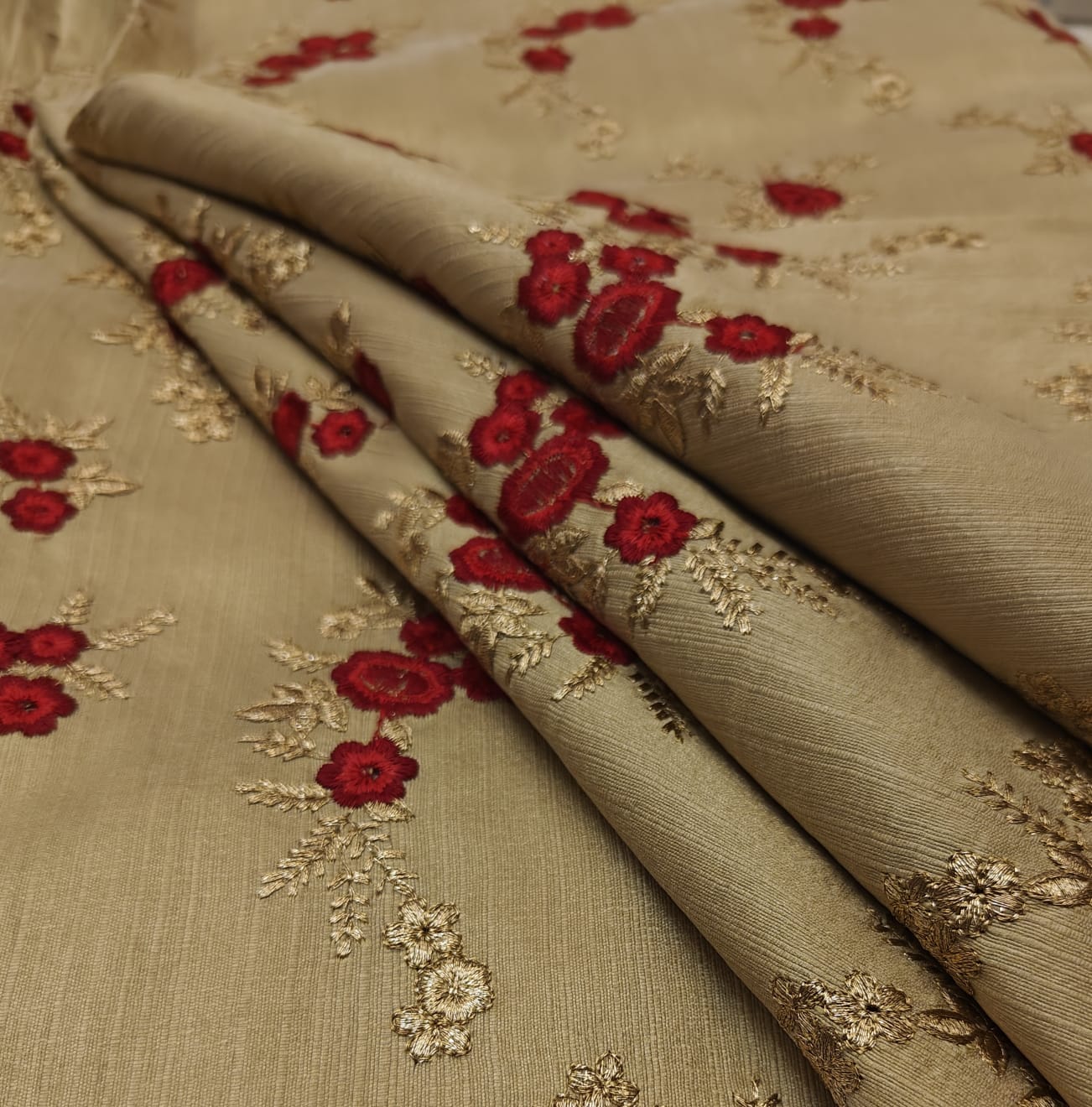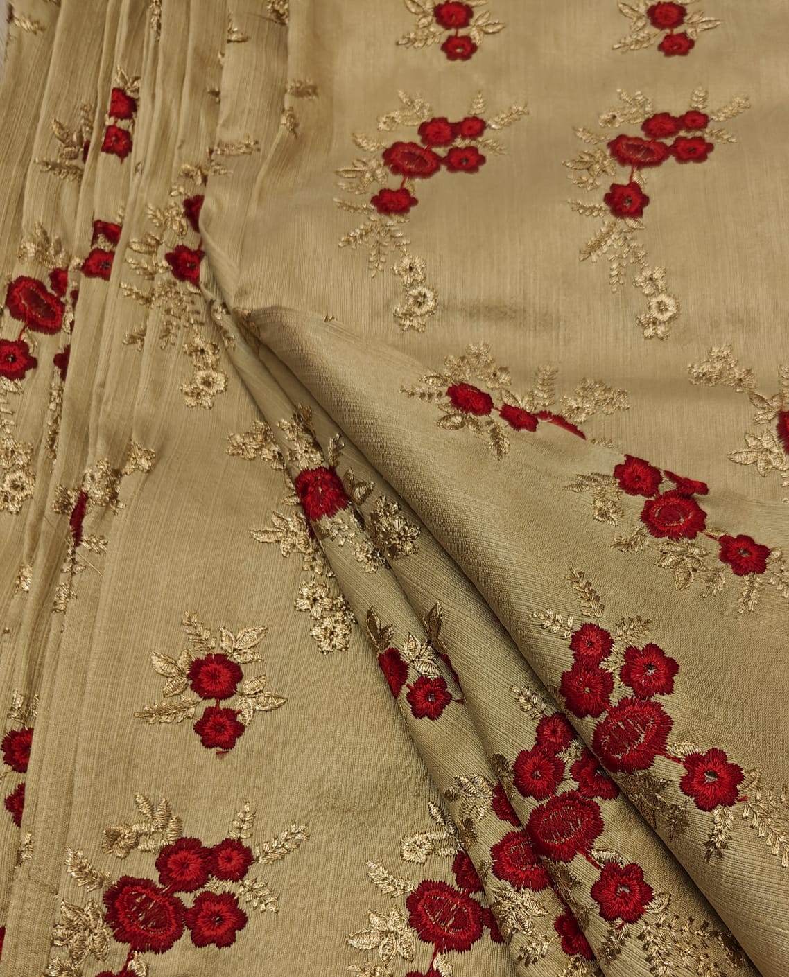 Brocade  Embroidered  gold color fabric with dainty red and metallic gold motifs 44" wide BRO1177