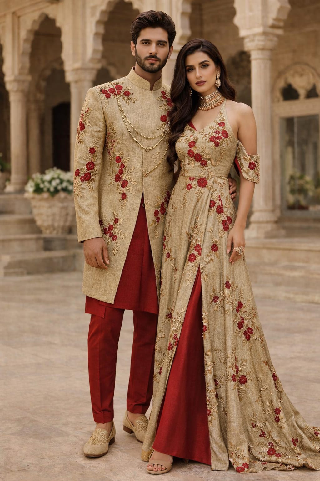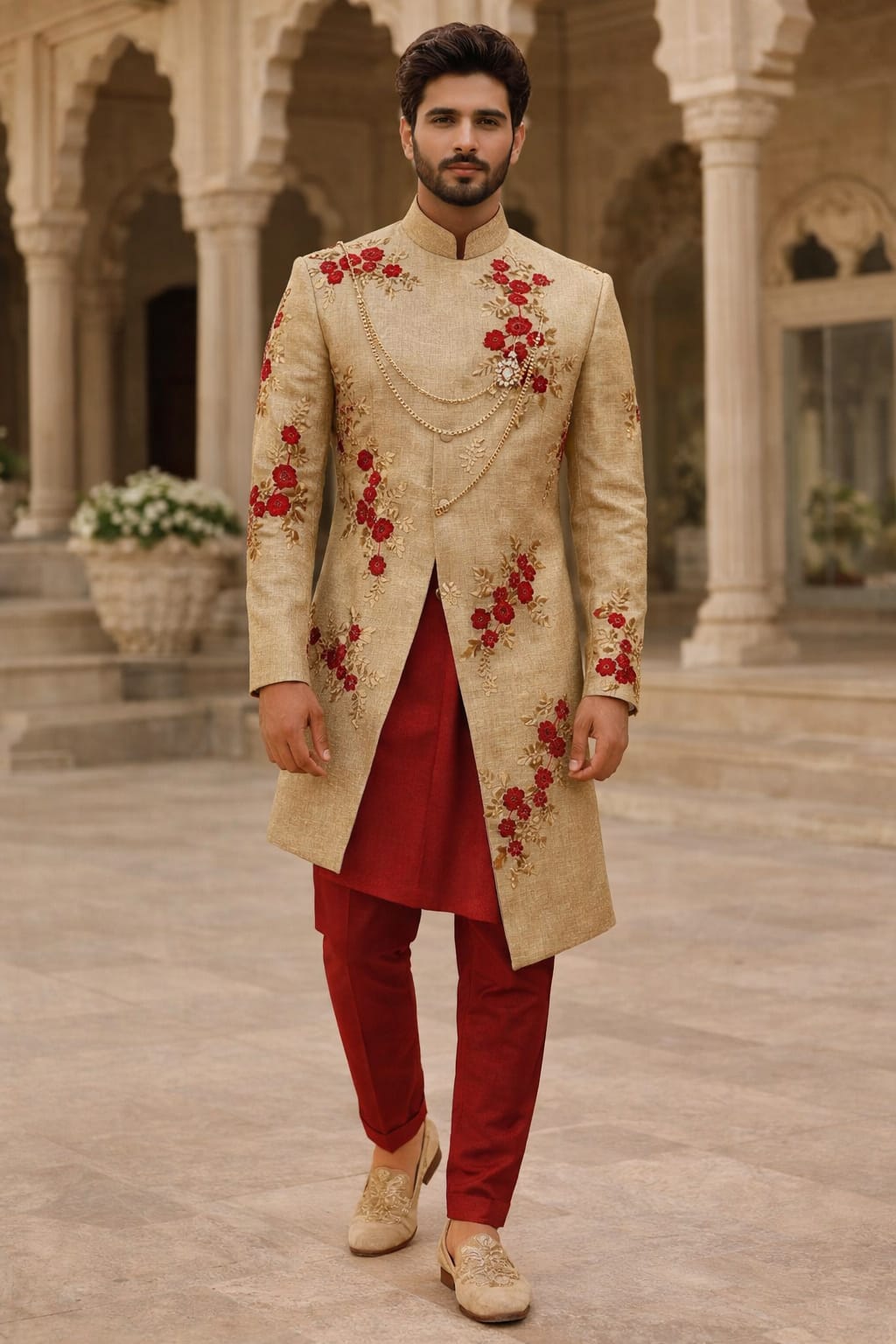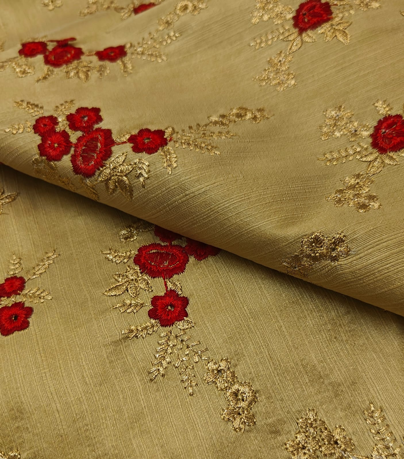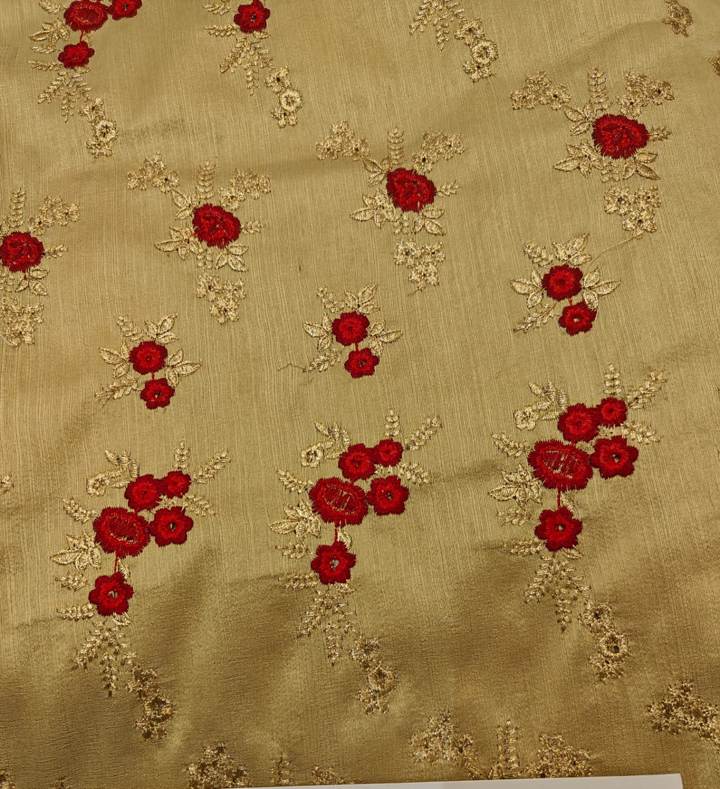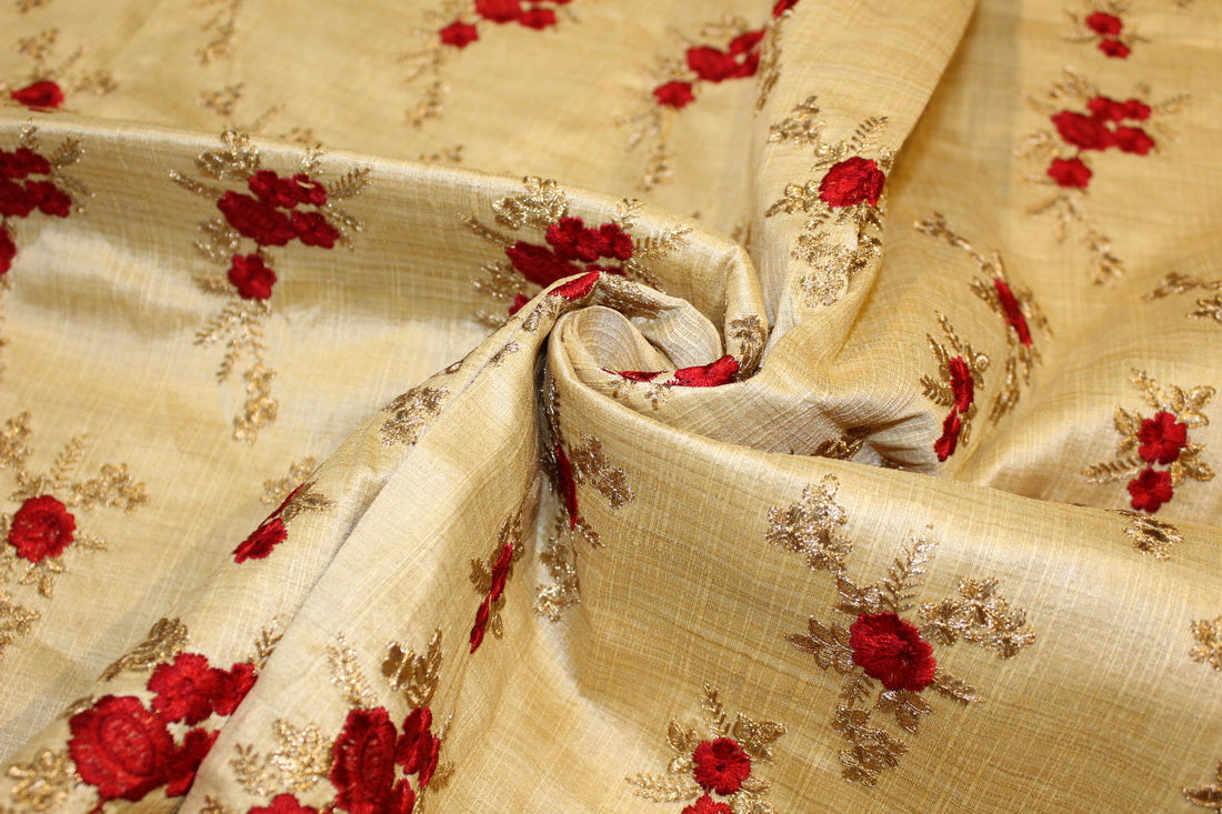 Brocade Embroidered gold color fabric with dainty red and metallic gold motifs 44" wide BRO1177