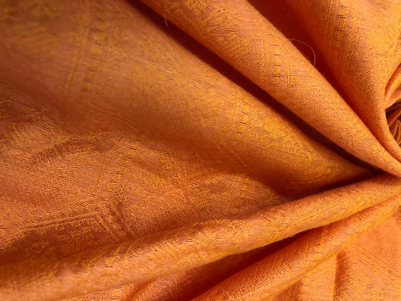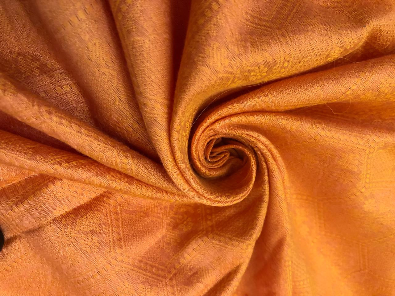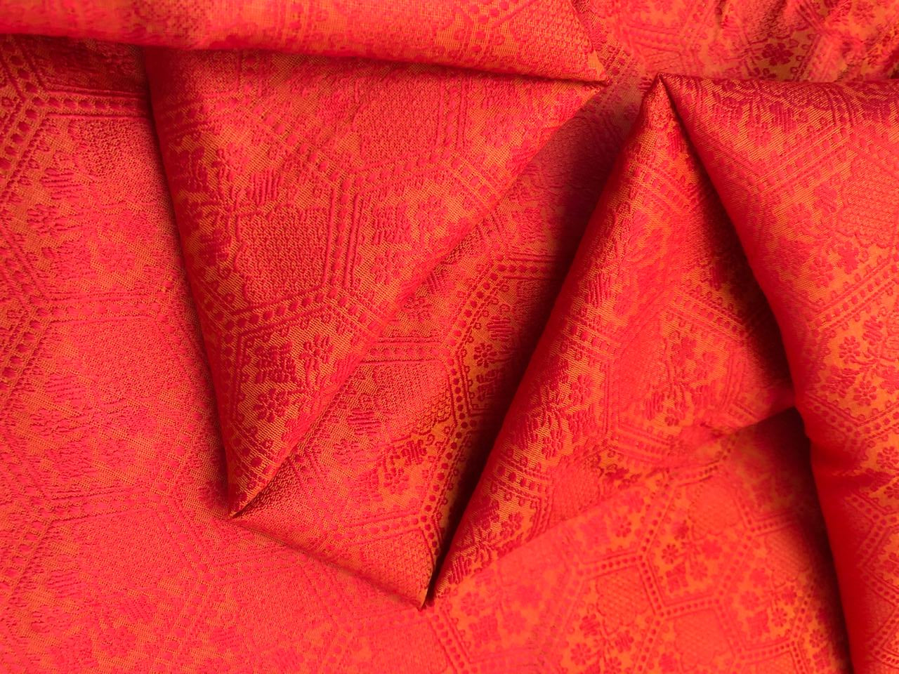 Silk Brocade fabric hexagon shaped motifs with flower motif within self  jacquard all over available in 4 colors  red/lime green/mango and orange BRO1143