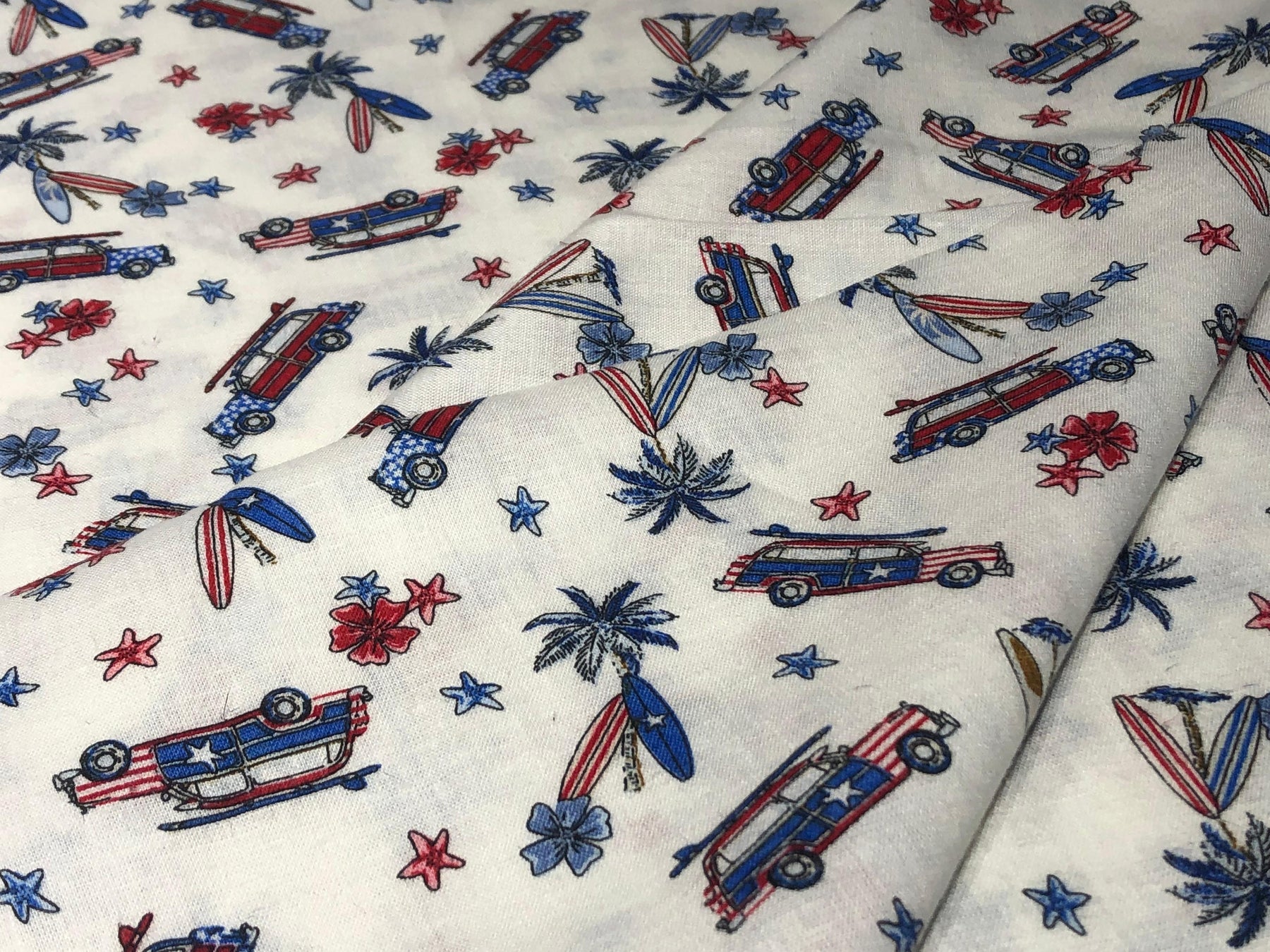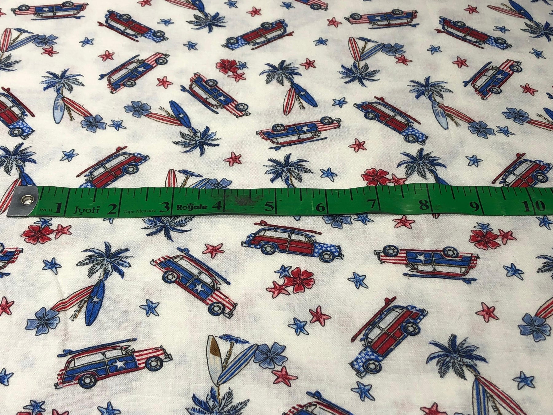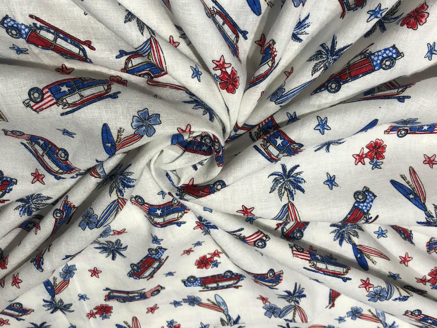100% Cotton Linen  56" wide resort wear palm, surf board ,car  print [17289]