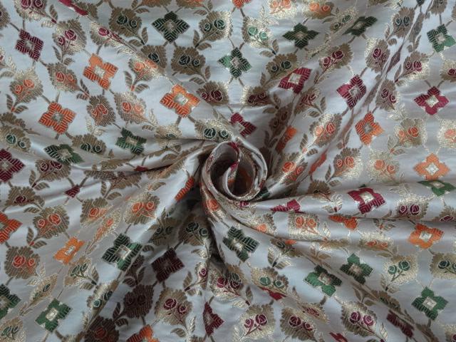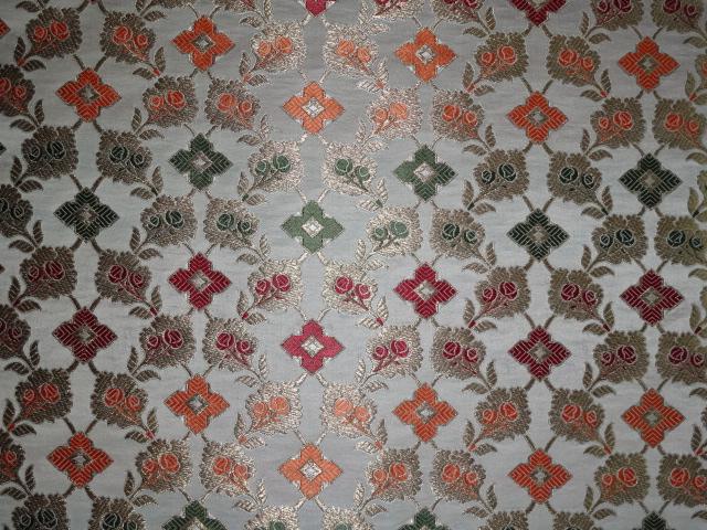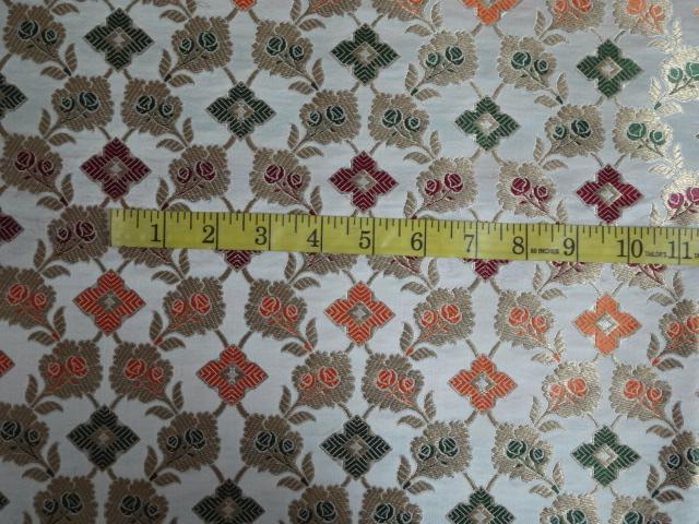 HEAVY BROCADE FABRIC CREAM,GREEN,ORANGE & GOLD METALLIC GOLD