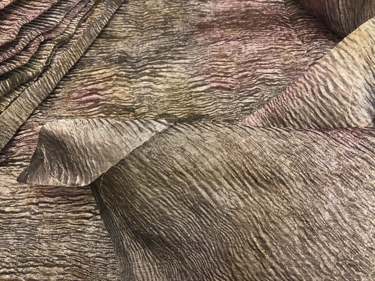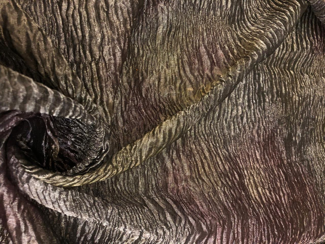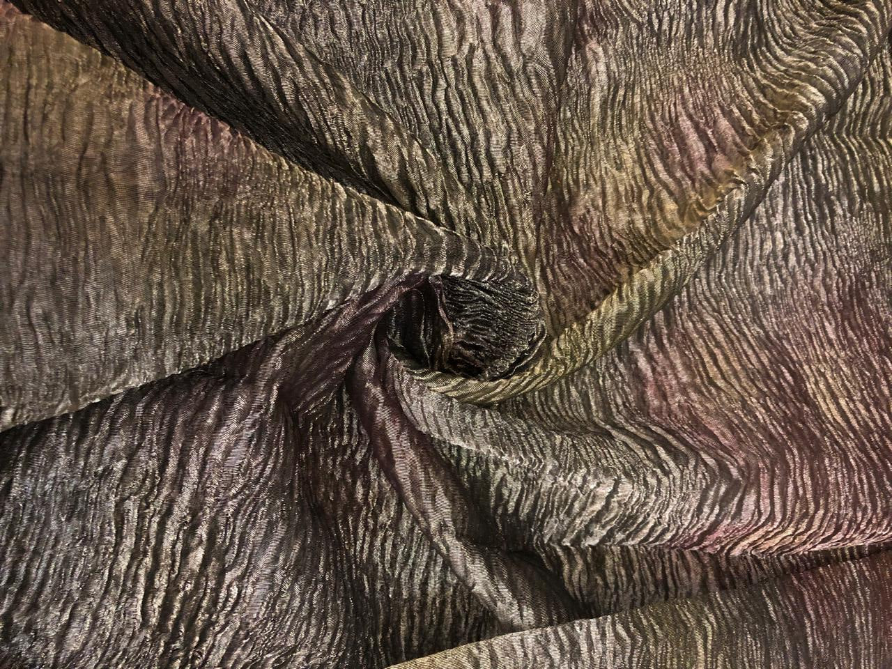 A crushed tissue stripe is a lightweight, often sheer fabric with a permanent crinkled or wrinkled texture and a striped pattern. The combination of the metallic sheen and the textured stripes gives the fabric a rich, artistic, and luxurious look.