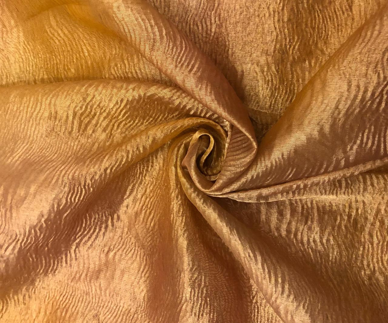 A crushed tissue stripe is a lightweight, often sheer fabric with a permanent crinkled or wrinkled texture and a striped pattern. The combination of the metallic sheen and the textured stripes gives the fabric a rich, artistic, and luxurious look.