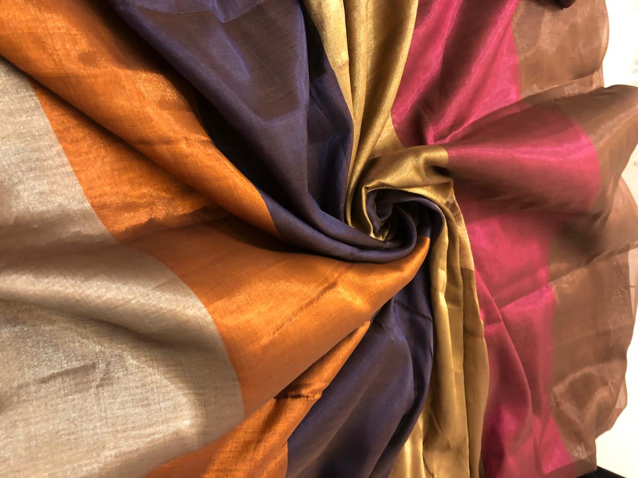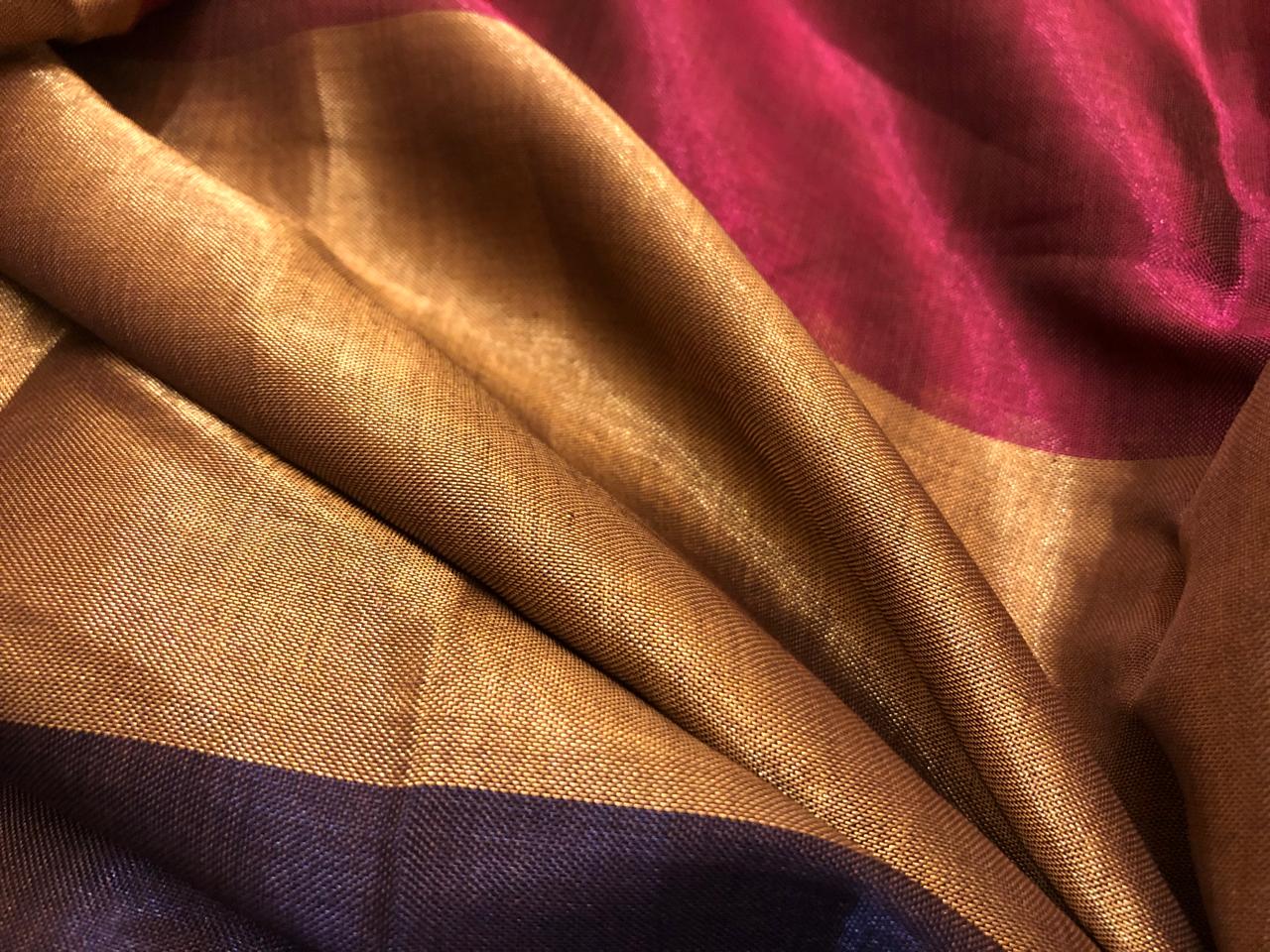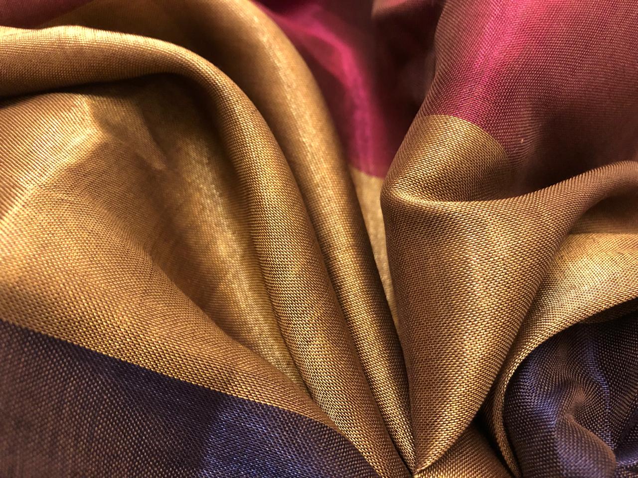 100% Pure Silk metallic tissue 44" wide 7" stripes of 6 colors brown/magenta/gold/deep purple/bronze and silver grey [18924]