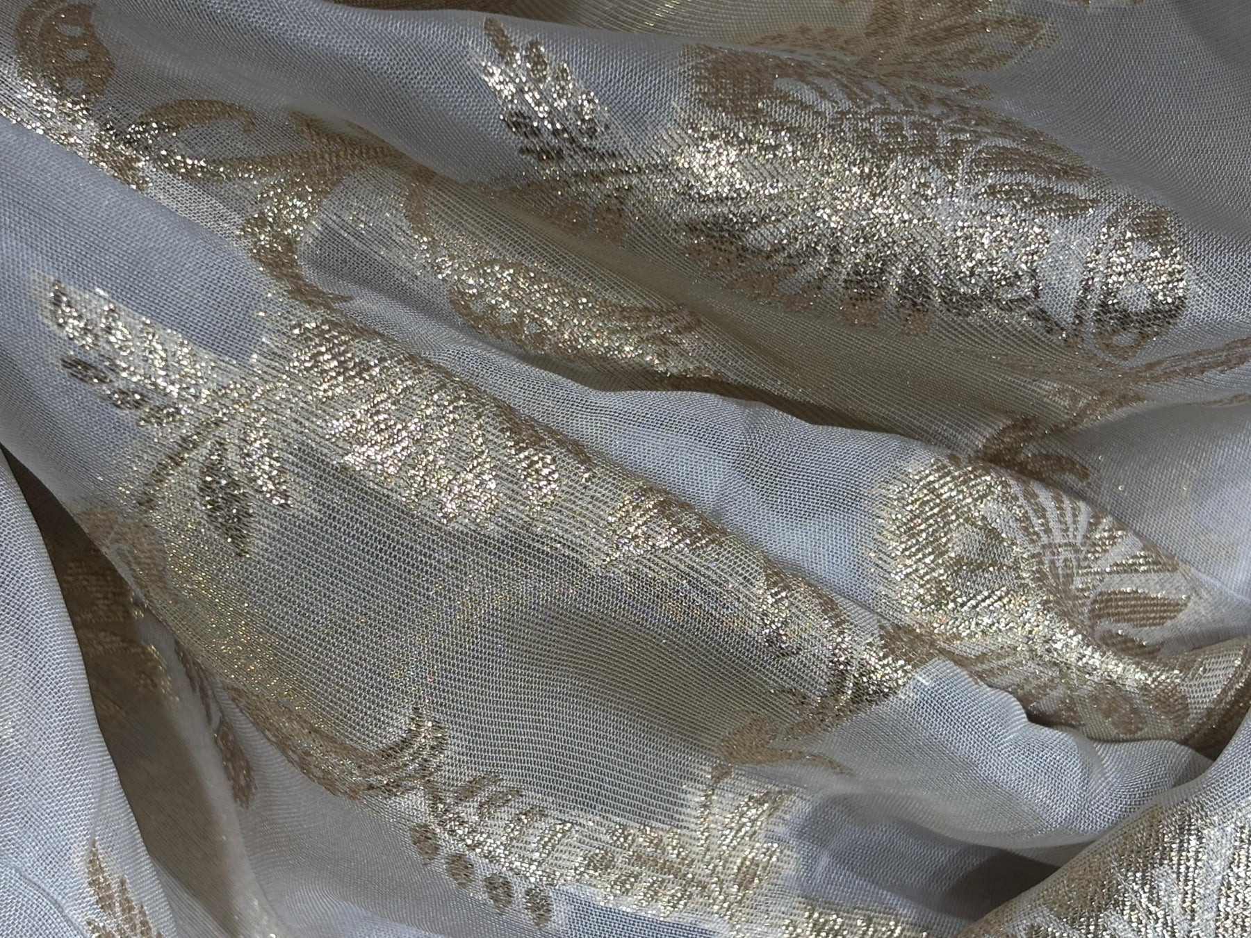 Tissue silk is a fine sheer silk well known for their distinctive characteristics of uniform structure, strength, and flexibility. The fabric is a jari thread as fine as silk thread. They look rich and also very highlighted.