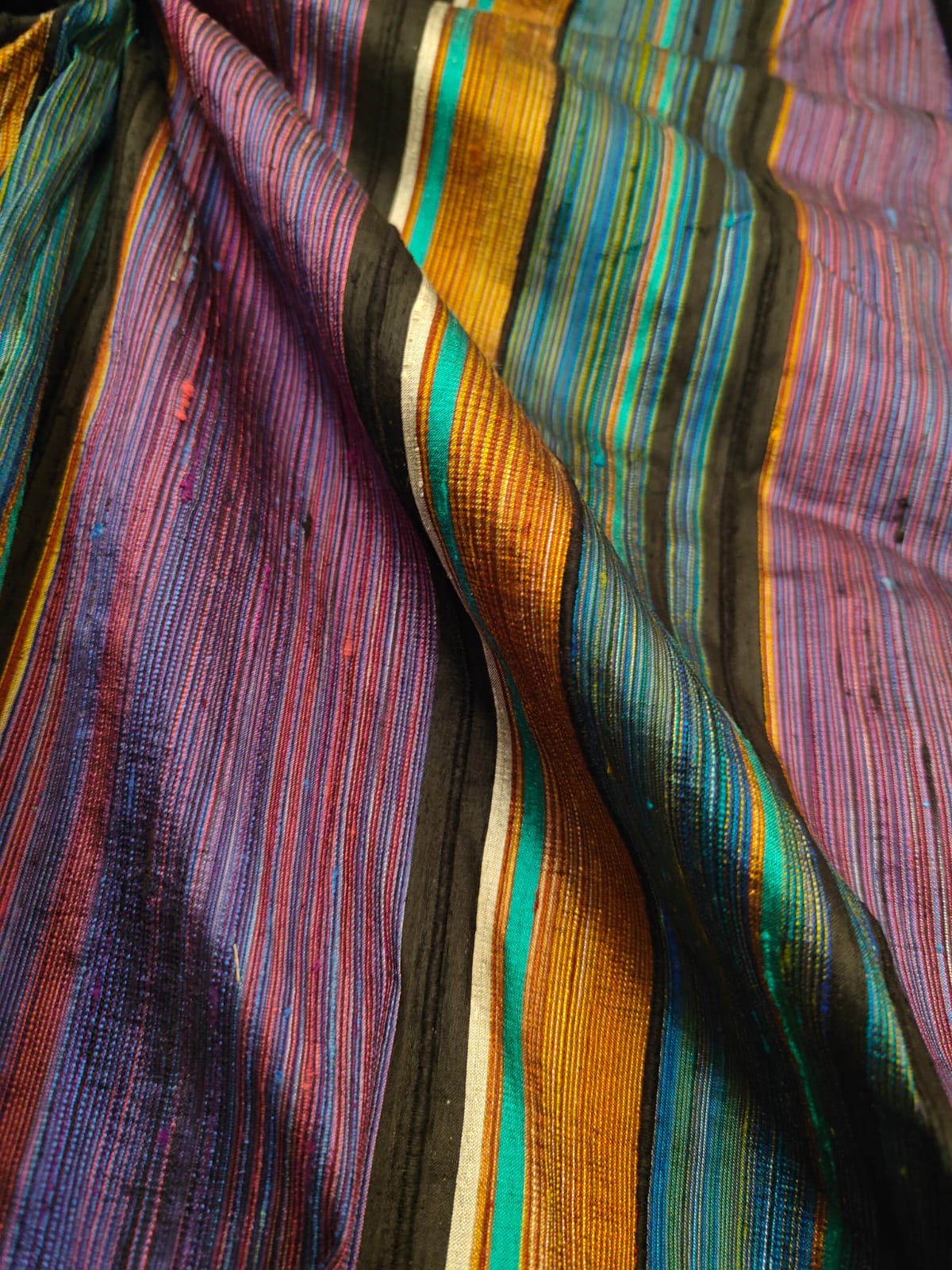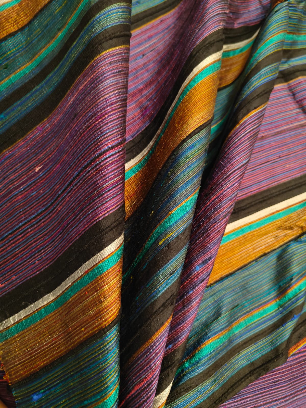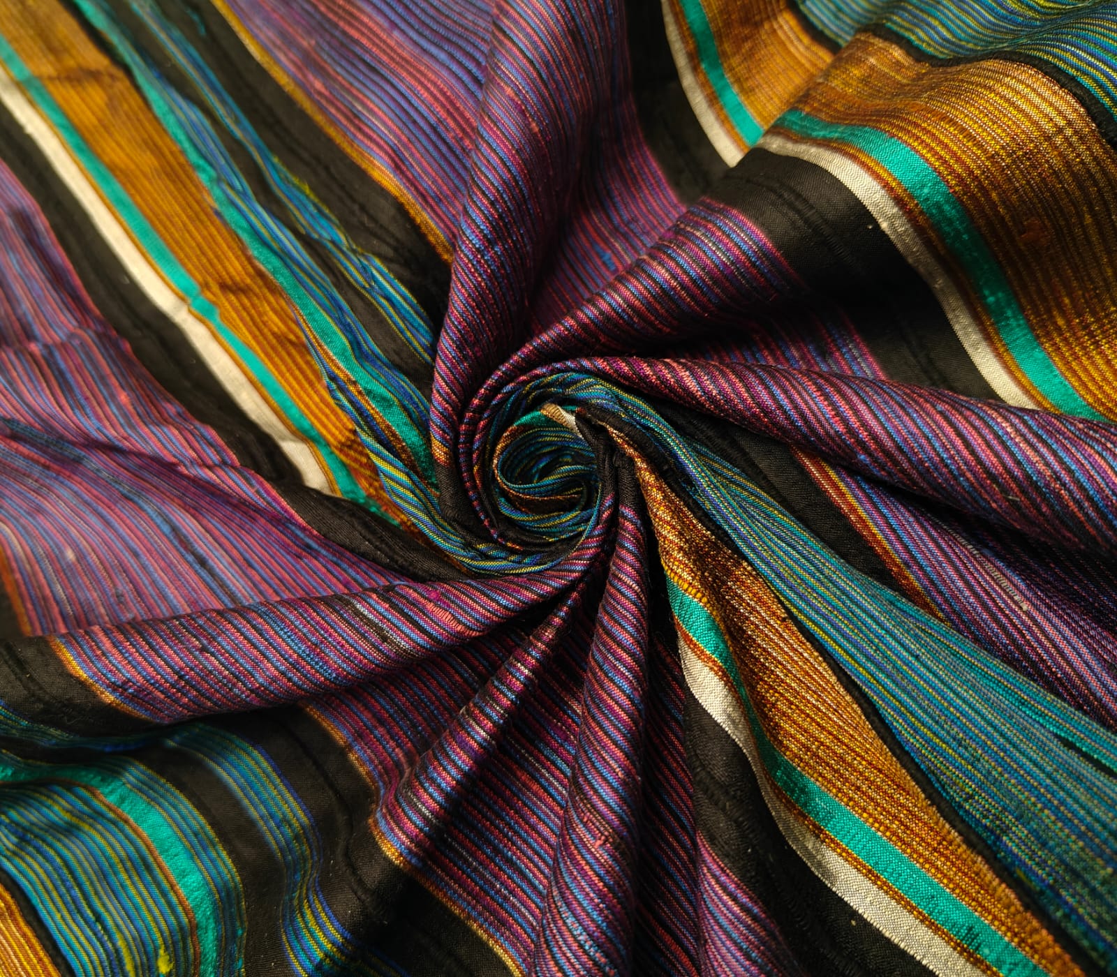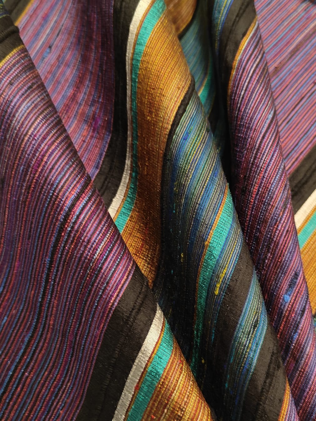 Dupioni (also referred to as Douppioni or Dupion) is a plain weave crisp type of silk fabric, produced by using fine thread in the warp and uneven thread reeled from two or more entangled cocoons in the weft. This creates tightly-woven yardage with a highly-lustrous surface.It is sometimes confused with 'shantung' or 'raw silk' which is usually lighter in weight and has a finer weave than dupion.