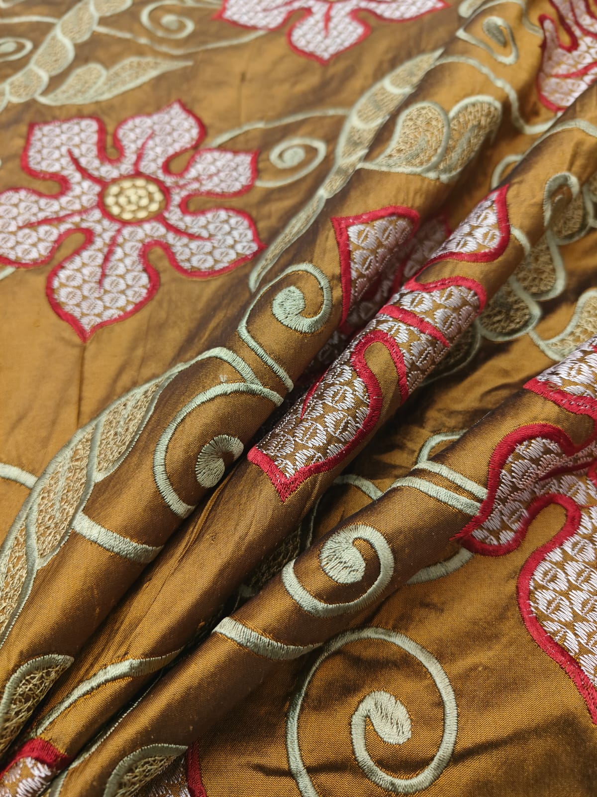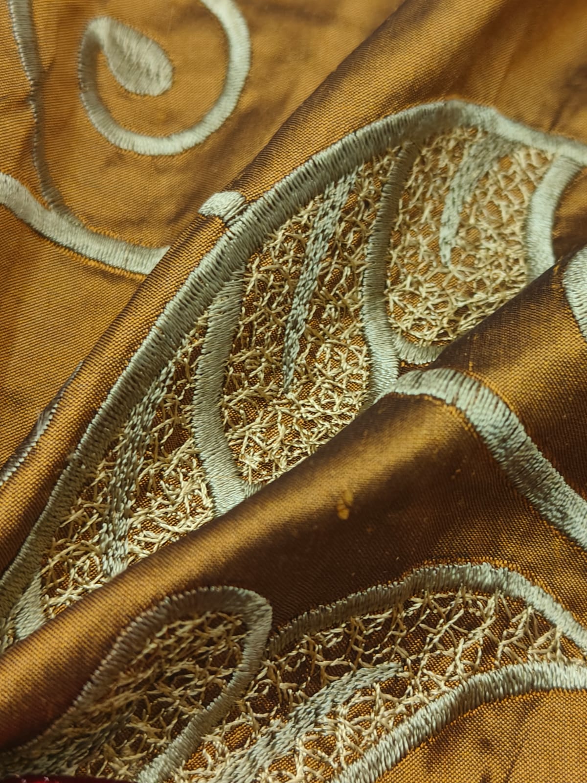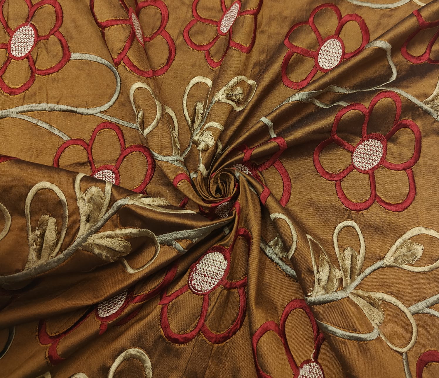 Dupioni (also referred to as Douppioni or Dupion) is a plain weave crisp type of silk fabric, produced by using fine thread in the warp and uneven thread reeled from two or more entangled cocoons in the weft. This creates tightly-woven yardage with a highly-lustrous surface.It is sometimes confused with 'shantung' or 'raw silk' which is usually lighter in weight and has a finer weave than dupion.