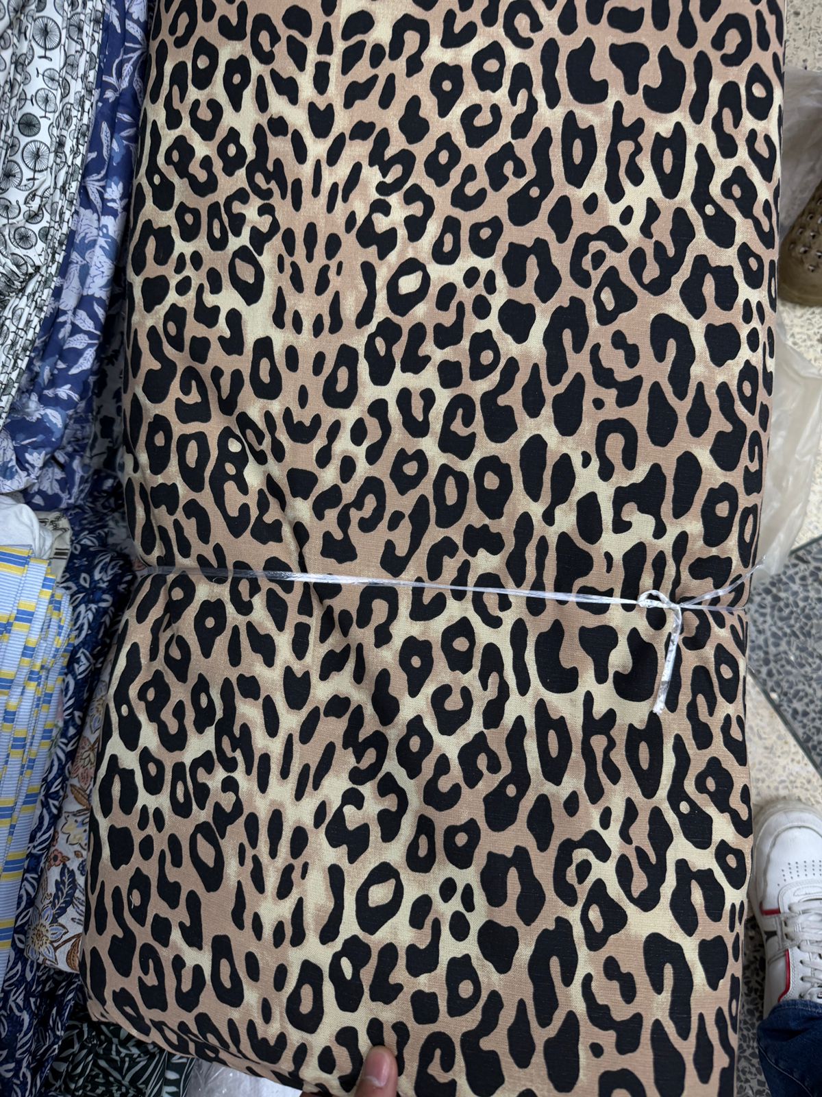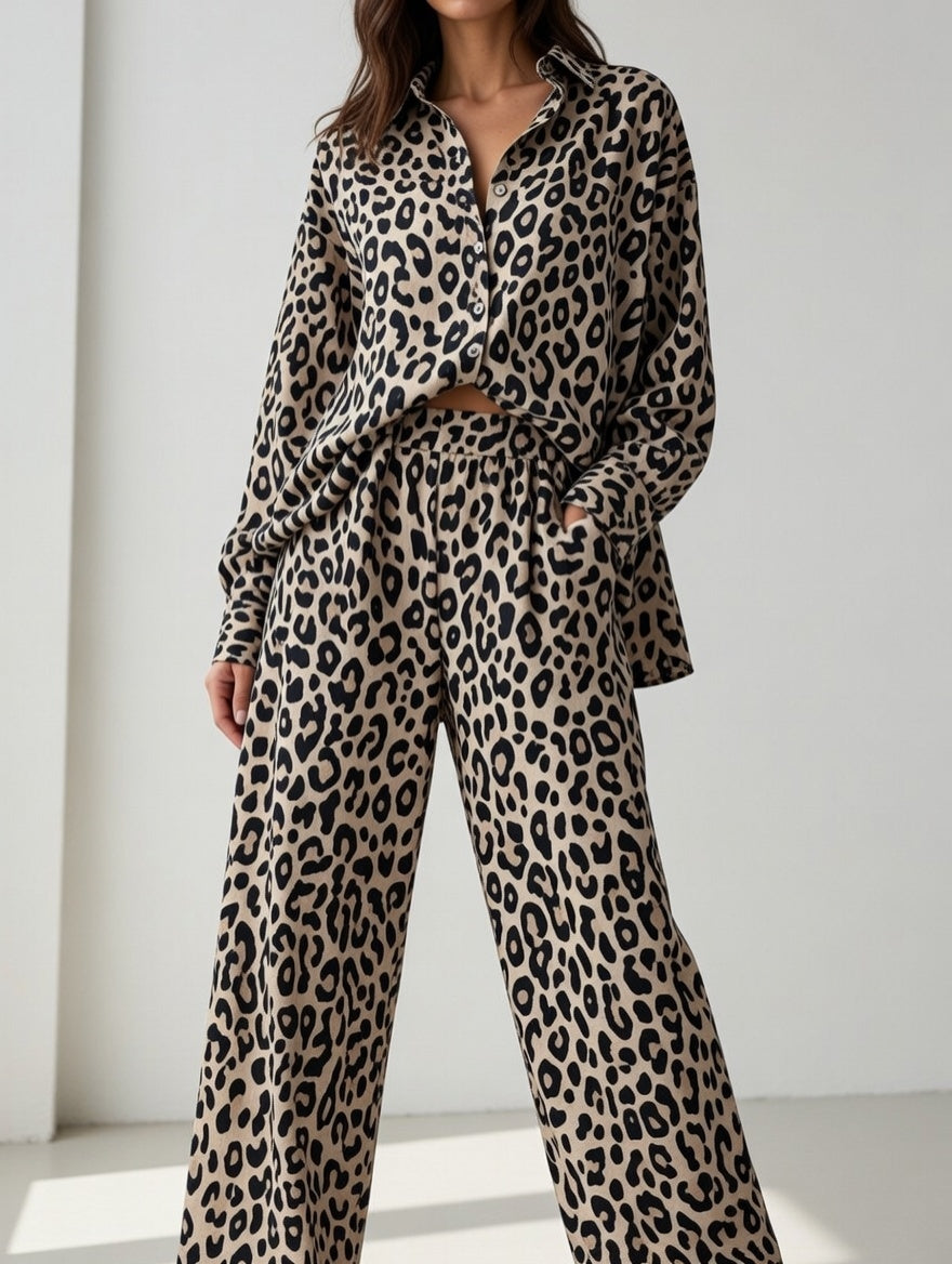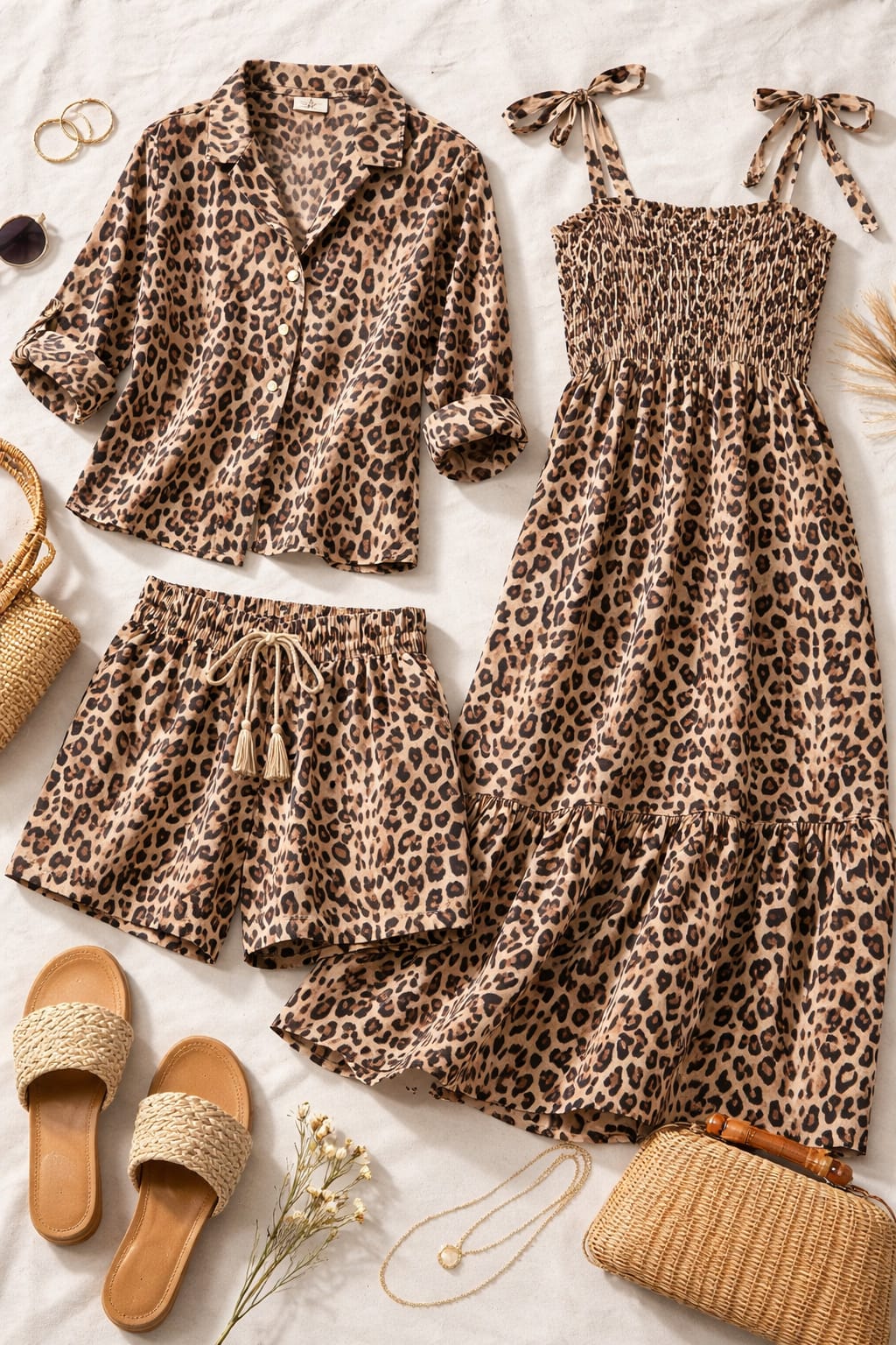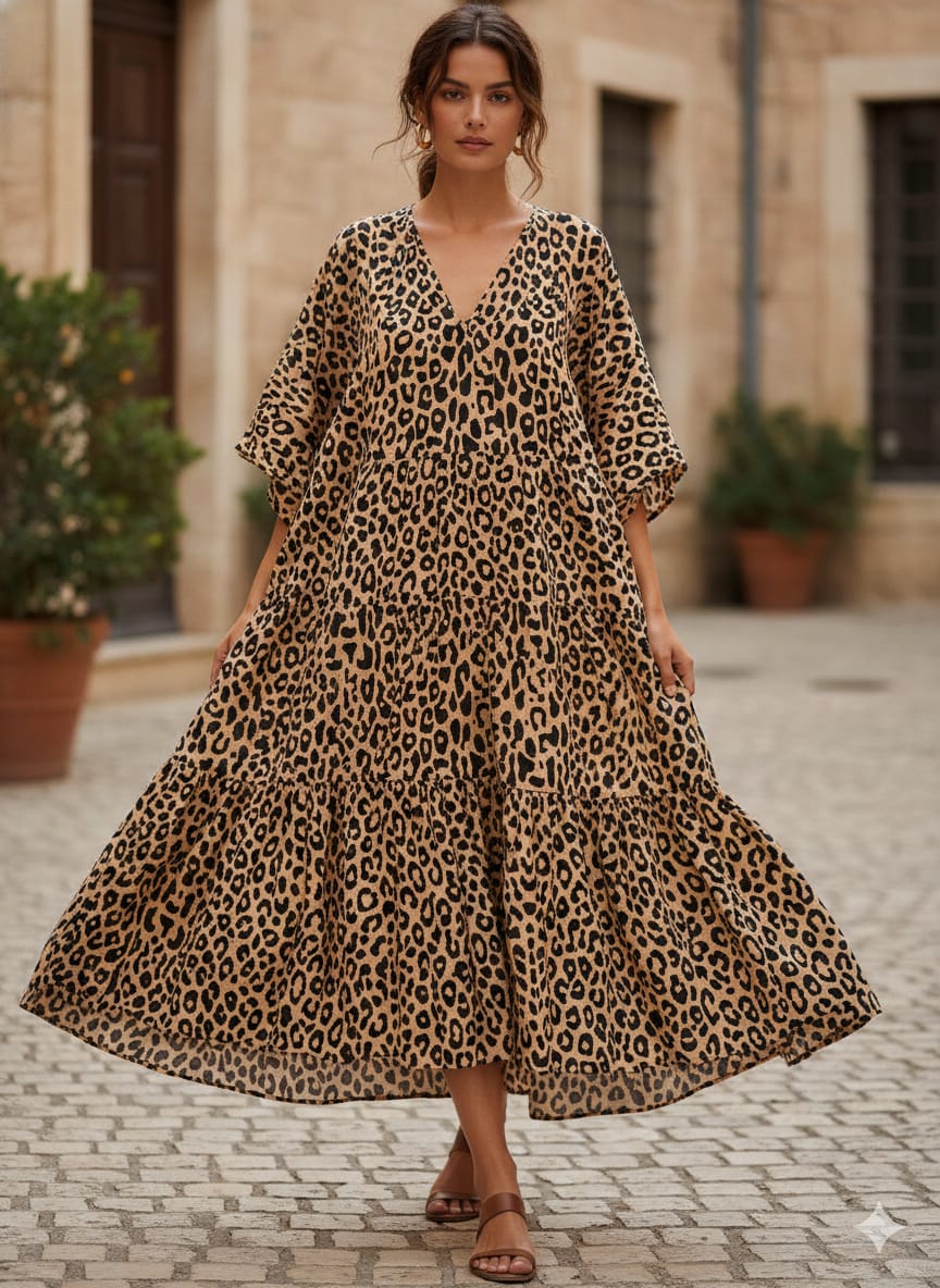 This fabric is a cotton-linen blend featuring a classic leopard animal print. The design is characterized by its organic, irregular spots in deep black and earthy brown tones set against a warm, sandy-beige background.Combine this fabric with olive green utility jackets, tan leather belts, and gold hoop earrings for a timeless, adventurous look.