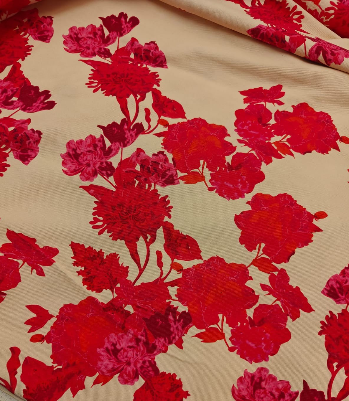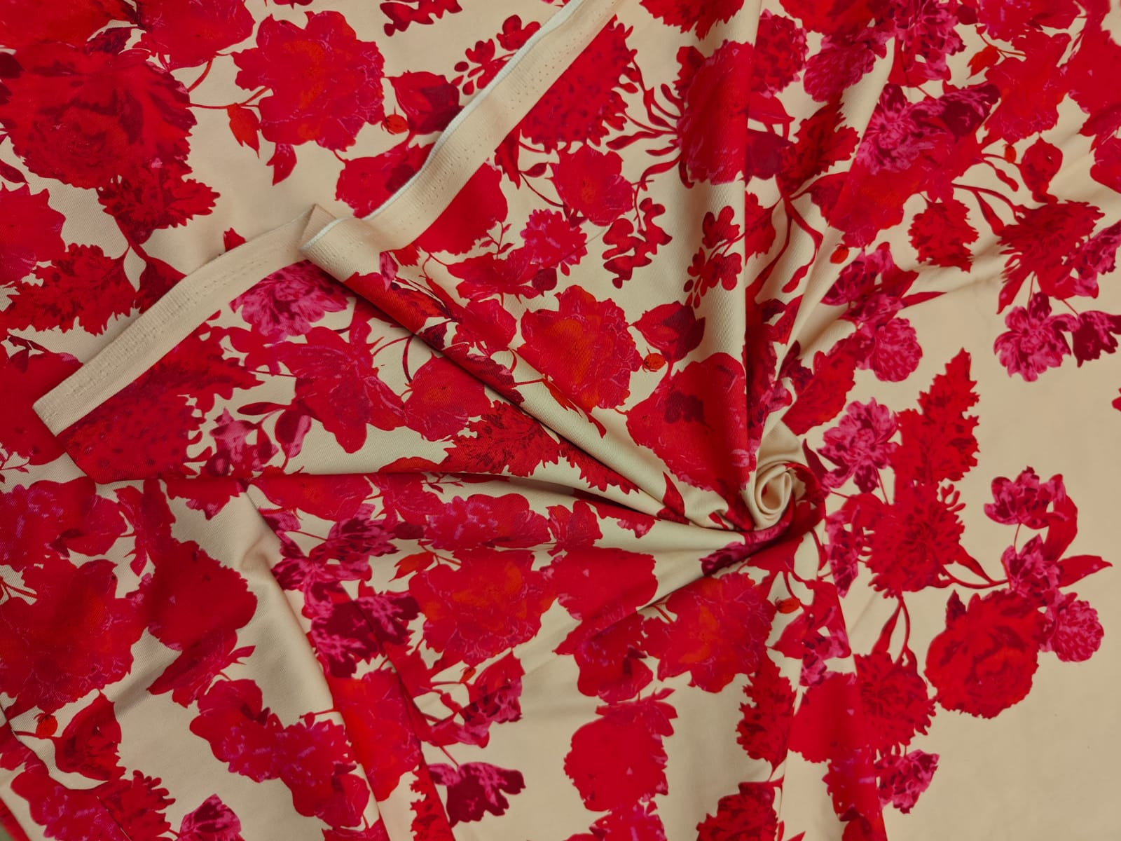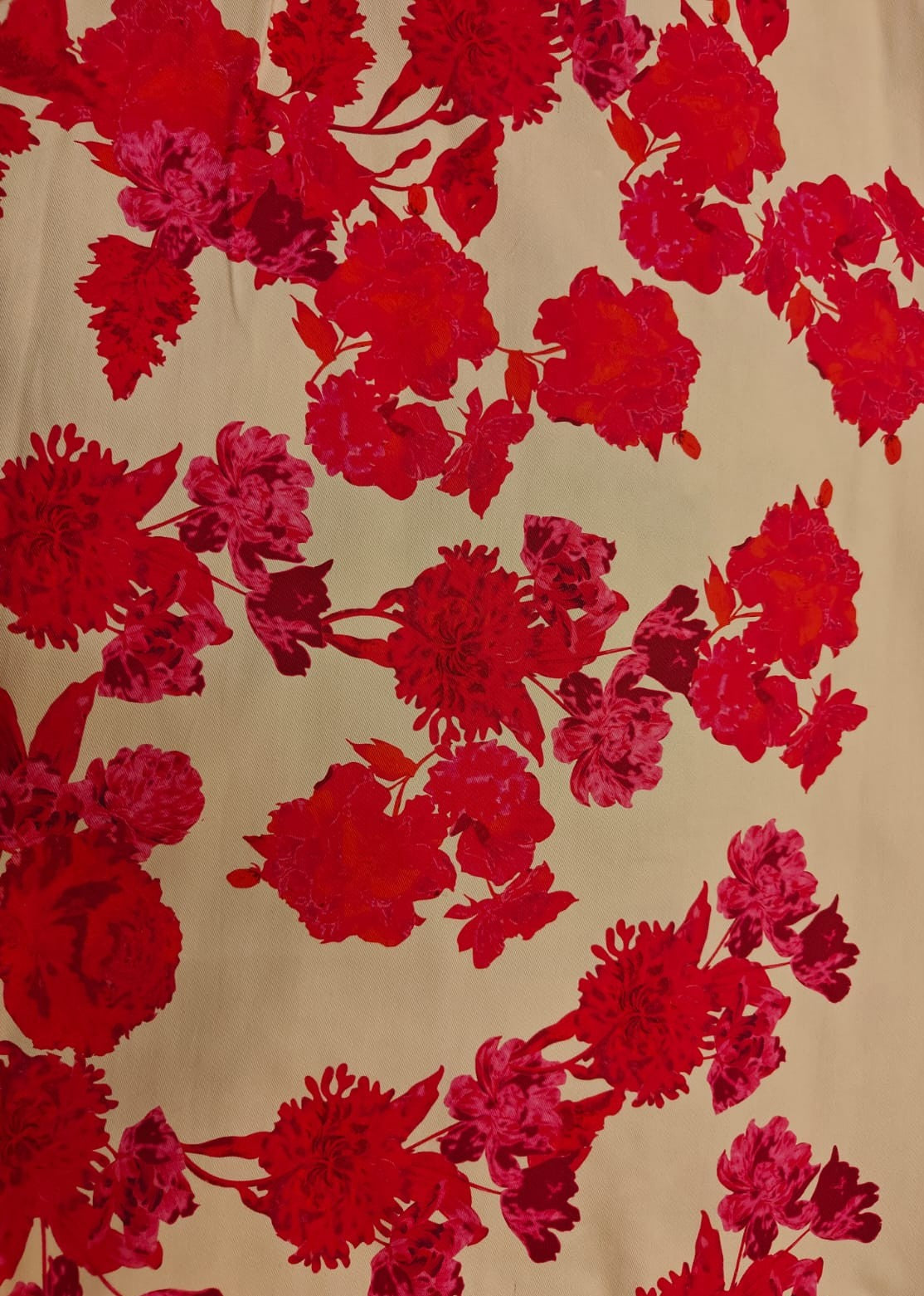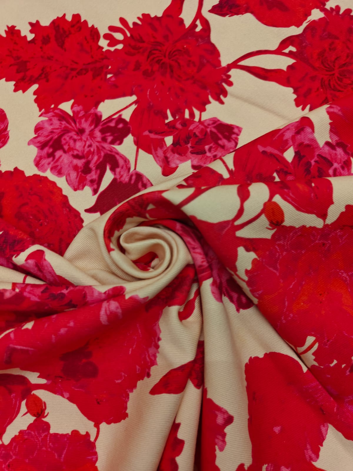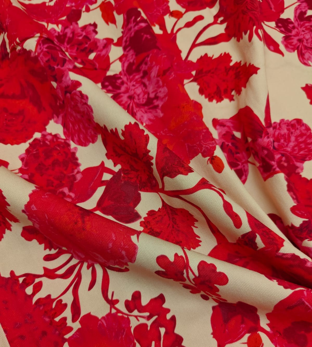 100% Liva Eco Tencel™️ Lyocell twill printed fabric, soft fluid drape, smooth diagonal twill weave visible, sustainable luxury textile, vibrant red and fuchsia floral print on warm nude base, rich color saturation, eco-conscious premium fabric,58" wide